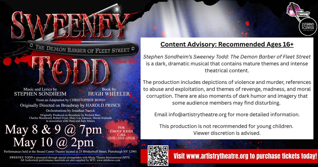 An infamous tale, Sweeney Todd, an unjustly exiled barber, returns to nineteenth century London, seeking vengeance against the lecherous judge who framed him and ravaged his young wife. The road to revenge leads Todd to Mrs. Lovett, a resourceful proprietress of a failing pie shop, above which, he opens a new barber practice. Mrs. Lovett's luck sharply shifts when Todd's thirst for blood inspires the integration of an ingredient into her meat pies that has the people of London lining up... and the carnage has only just begun!
